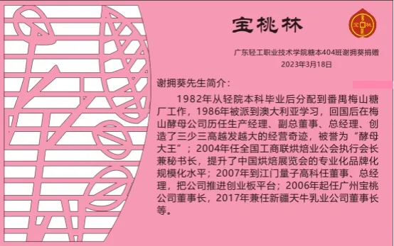 食品與生物技術(shù)學(xué)院黨總支書(shū)記周愛(ài)芳給參與本次活動(dòng)的師生,講述了優(yōu)秀校友謝擁葵先生的先進(jìn)事跡。以此為榜樣,學(xué)習(xí)如何傳承廣輕精神,傳遞對(duì)母校感恩。